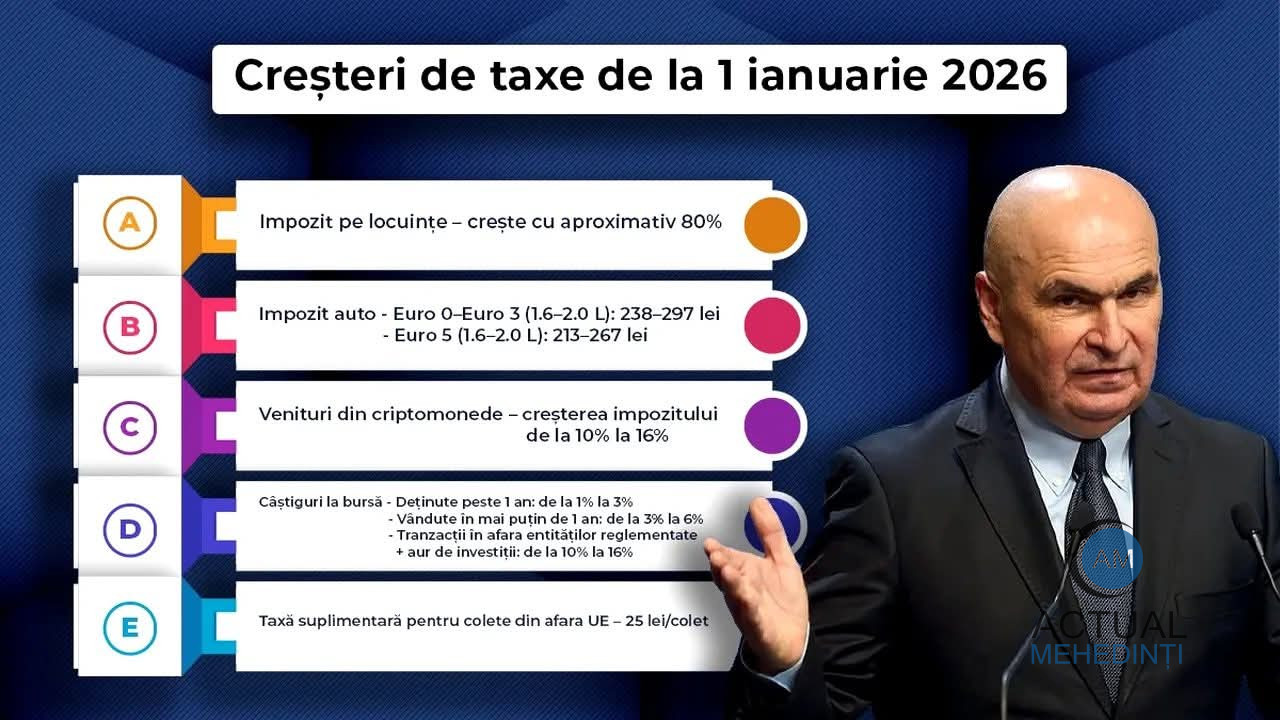 De la 1 ianuarie 2026, au intrat în vigoare noile taxe și impozite adoptate de Parlament și validate de CCR. Cresc impozitele pe locuințe și terenuri, apar taxe noi pentru mașini și coletele din afara UE, se majorează impozitele pe investiții, criptomonede și dividende, iar accizele duc la scumpiri în lanț. Guvernul spune că măsurile sunt necesare pentru reducerea deficitului.