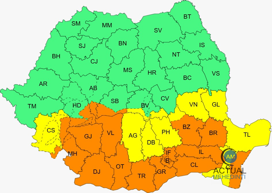 ANM a emis cod portocaliu de vreme rea, valabil în intervalul 2 octombrie, ora 10.00 – 3 octombrie, ora 10.00. Avertivarea vizează ploi importante cantitativ în județele Mehedinți, Dolj, Olt, Vâlcea și Gorj.