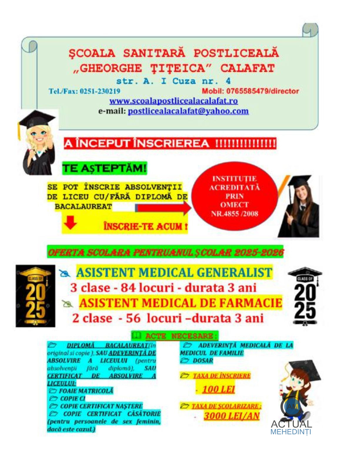 Școala Sanitară Postliceală „Gheorghe Țițeica” din Calafat anunță cu deosebită bucurie organizarea evenimentului aniversar „Sfert de veac de existență”, care va avea loc vineri, 17 octombrie 2025, la Muzeul de Artă și Etnografie din Calafat, începând cu ora 10:00. Evenimentul marchează un sfert de secol de excelență în formarea profesională a viitorilor asistenți medicali, de implicare în comunitate și de promovare a valorilor umane și educaționale.