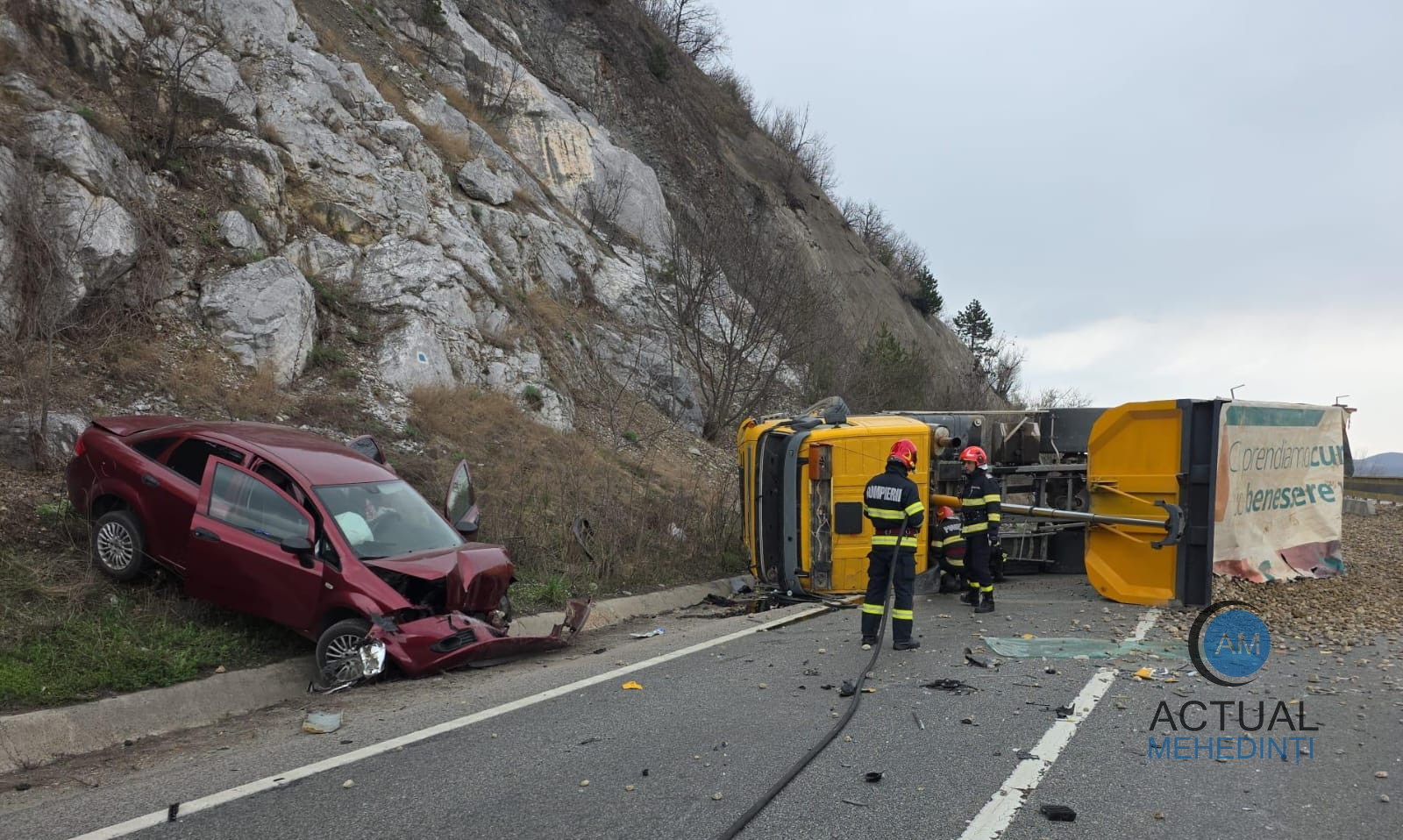 Accident, pe DN 6, în zona viaductelor! Autoutilitară cu piatră, răsturnată! Trafic blocat!