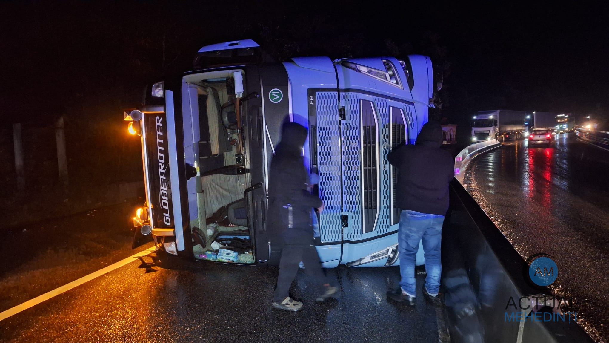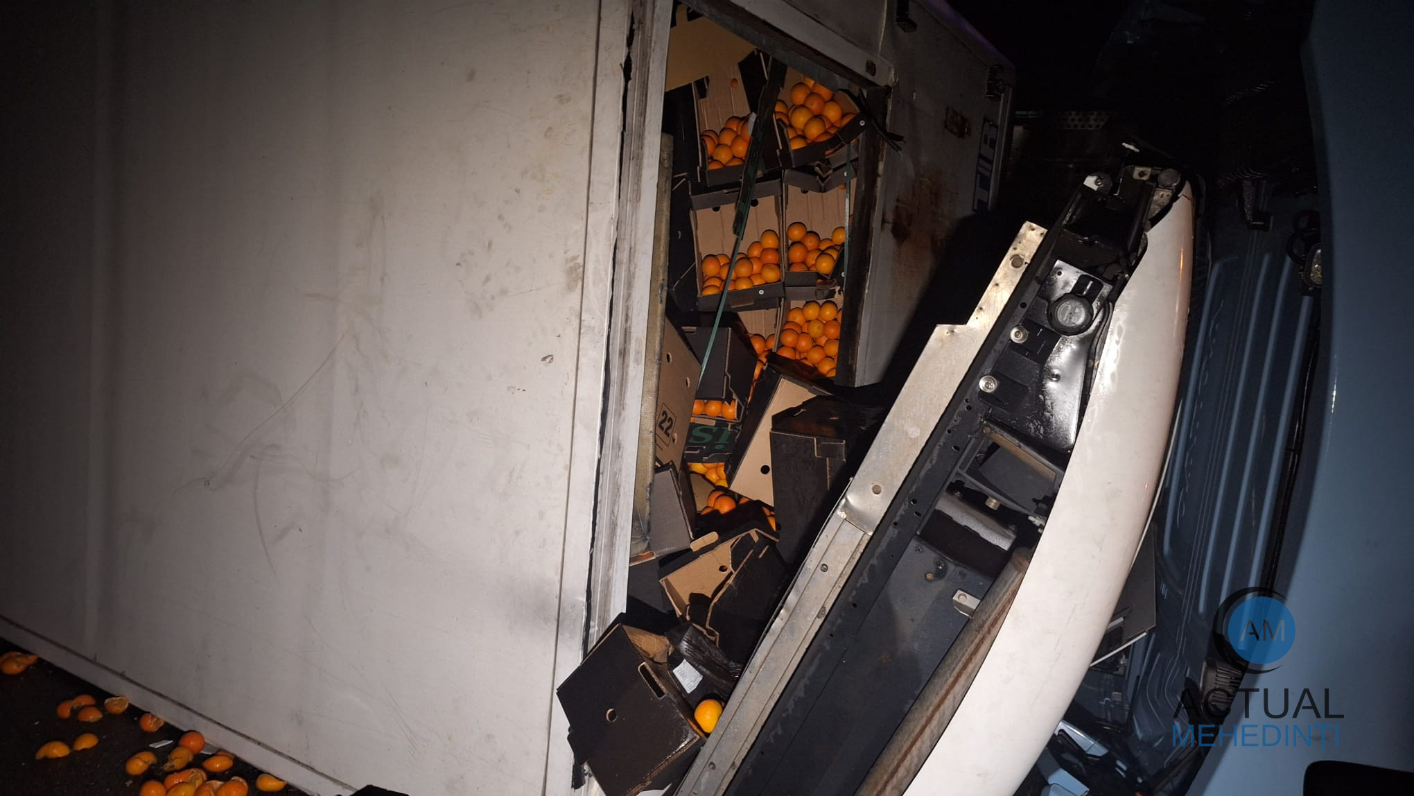 Șoferul turc ar fi pierdut controlul asupra volanului, pe fondul carosabilului umed. Nu sunt înregistrate victime. Autotrenul este încărcat cu portocale.