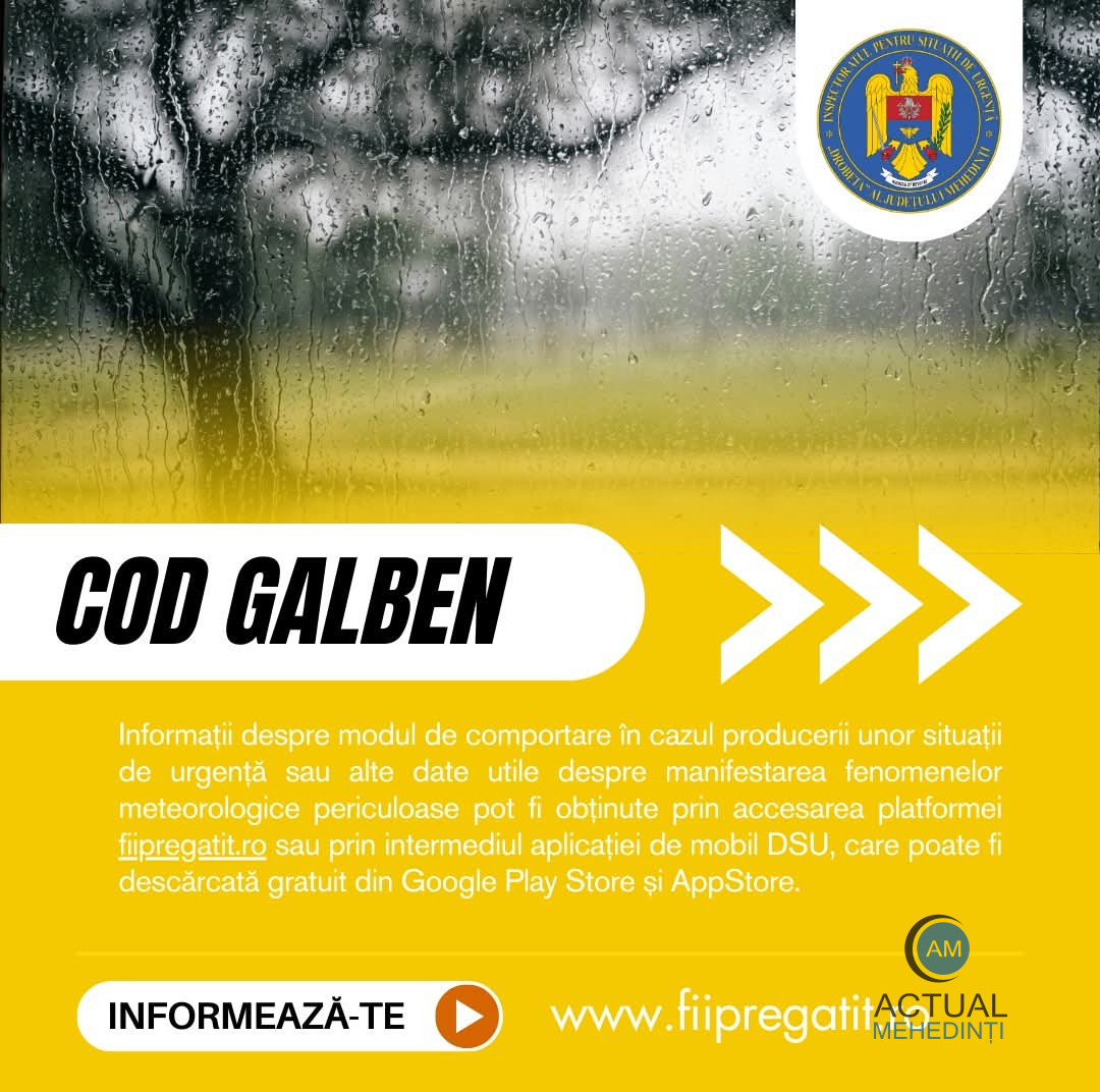 ANM a emis cod galben de ploi, valabil până la ora 15:00, pentru 13 localități din județ.