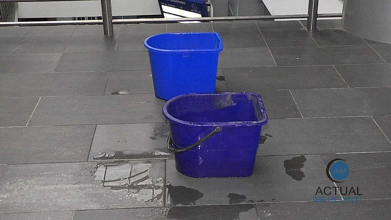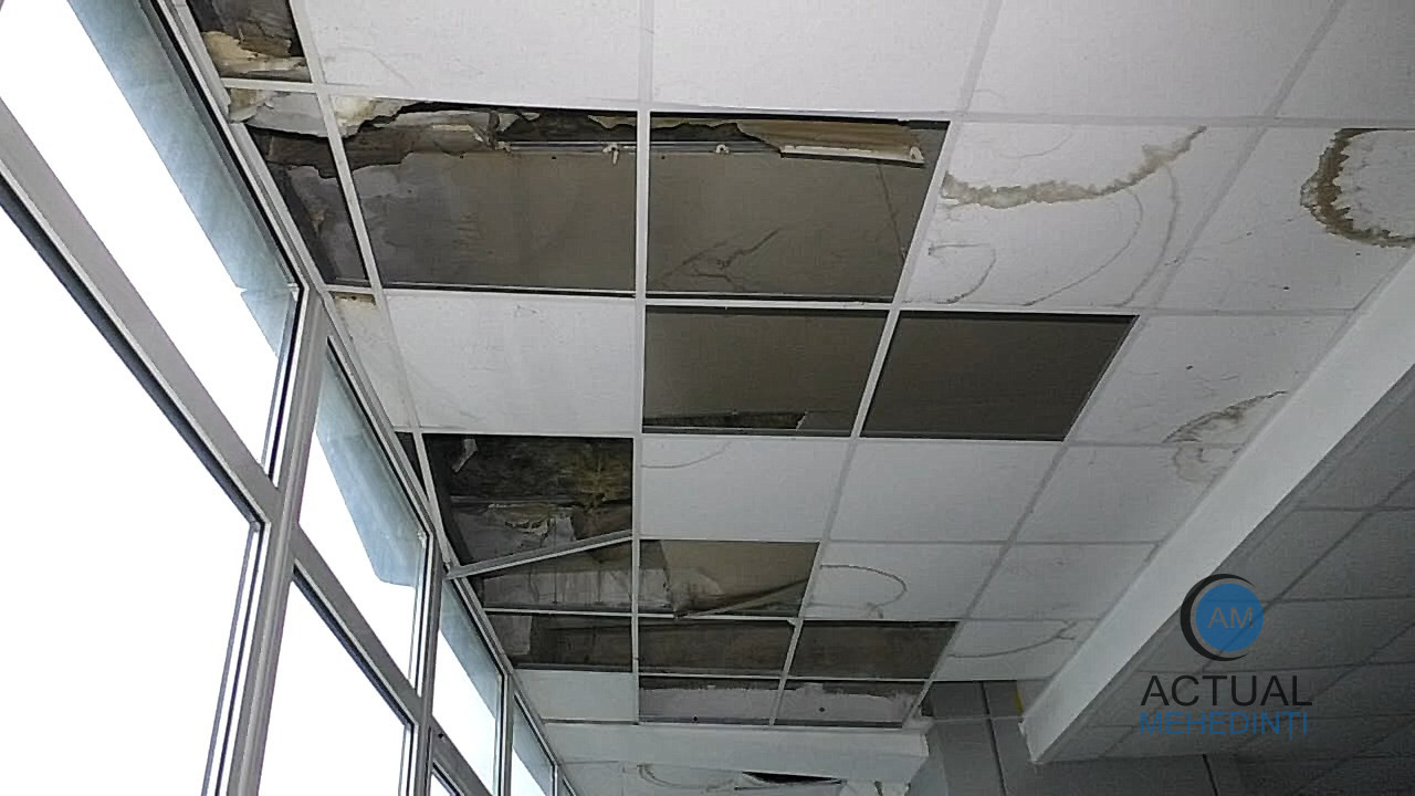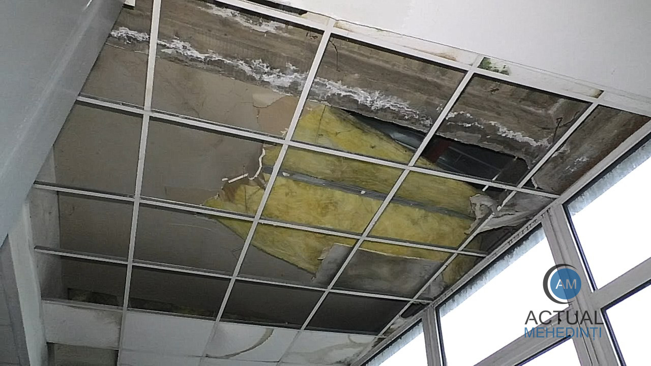 Plouă de zile întregi în Drobeta Turnu Severin, iar apa a pătruns în clădire. Pentru a prelua cantitățile de apă, angajații au pus, din nou, găleți. De altfel, din cauza fenomenelor meteorologice, înregistrate în timp (în special grindină) părți din tavan s-au prăbușit.