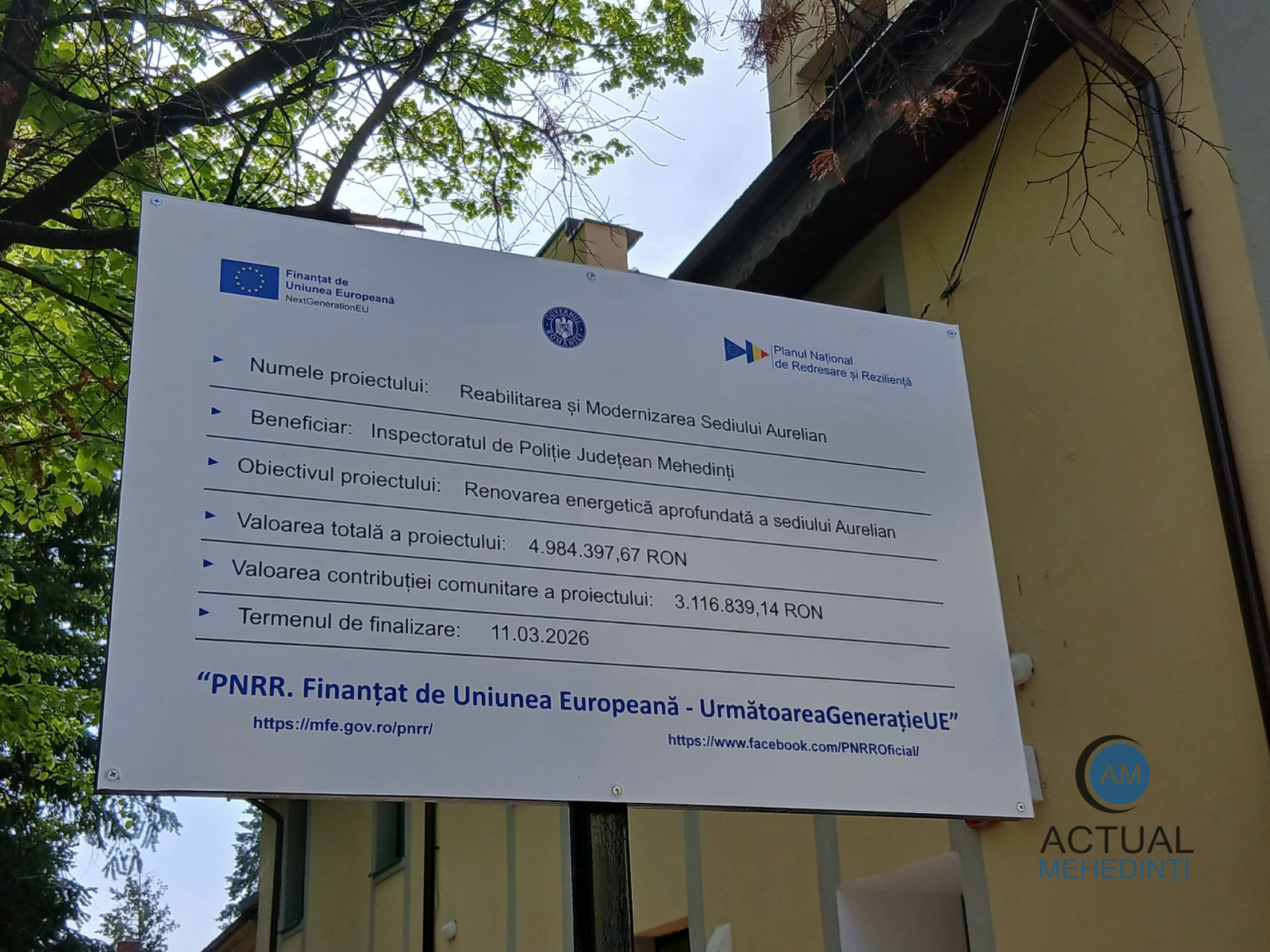 Investiția s-a realizat în cadrul Planului Național de Redresare și Reziliență /Componenta 5- Valul renovării/Axa 2-Schema de Granturi pentru eficiență eneregetică în clădiri publice/ Operațiunea B.2.-Renovarea energetică moderată sau aprofundată a clădirilor publice, care urmărește obiectivele generale ale Mecanismului de Redresare și Reziliență(MRR), mecanism creat la nivelul Uniunii Europene ca instrument financiar temporar. Proiectul a fost implementat în parteneriat de către Ministerul Afacerilor Interne, în calitate de lider de parteneriat și Inspectoratul de Poliție Județean Mehedinți în calitate de partener 2 (beneficiar).