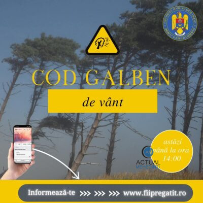 Până la ora 14:00, județul Mehedinți este sub atenționare meteorologică Cod Galben de intensificări ale vântului cu viteze la rafală de 50…70 km „Apelați numărul unic de urgenţă 112 doar…