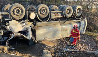 Accident în Jidoștița! S-a răsturnat cu basculanta în șanț.