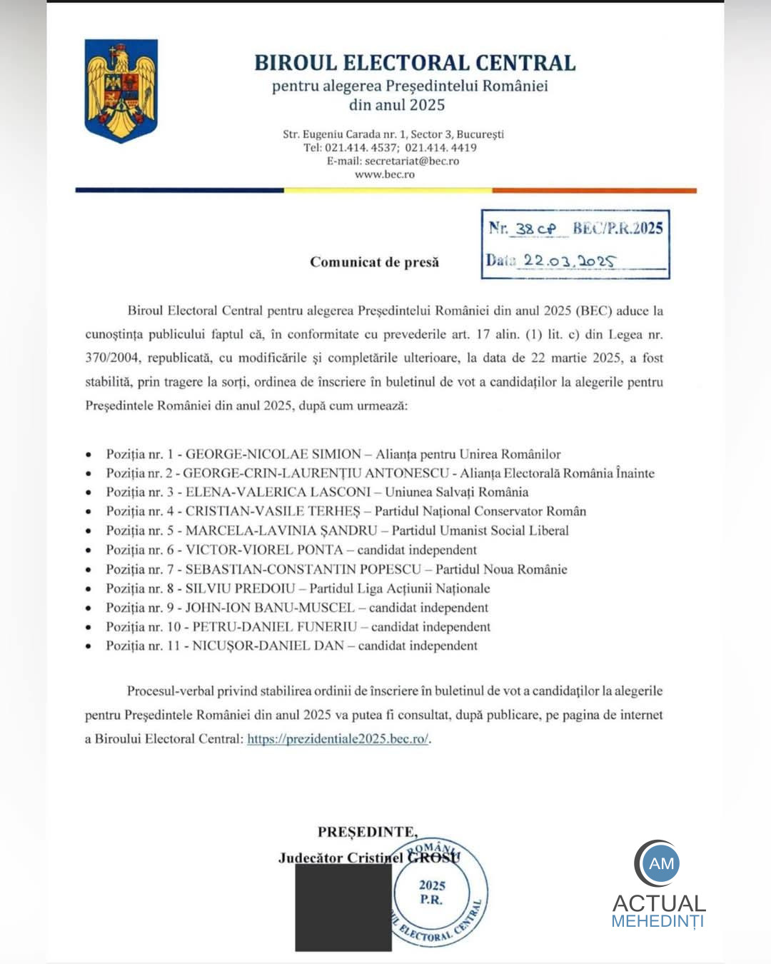 Biroul Electoral Central a tras la sorți ordinea candidaților pe buletinele de vot. George Simion este cel care va deschide lista, urmat de Crin Antonescu și Elena Lasconi.