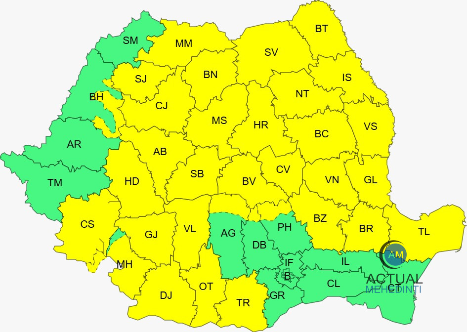 ANM a emis cod galben de vânt pentru ziua de marți (valabil în intervalul 10:00 – 07 aprilie, ora 21:00). În intervalul menționat, în Transilvania, Oltenia, Moldova, local în Maramureș, în sud-vestul și nord-estul Munteniei și în nordul Dobrogei, vor fi intensificări ale vântului cu viteze de 50…70 km/h. La munte, rafalele vor fi de 70…90 km/h, iar la altitudini de peste 1700 m de 100…120 km/h.