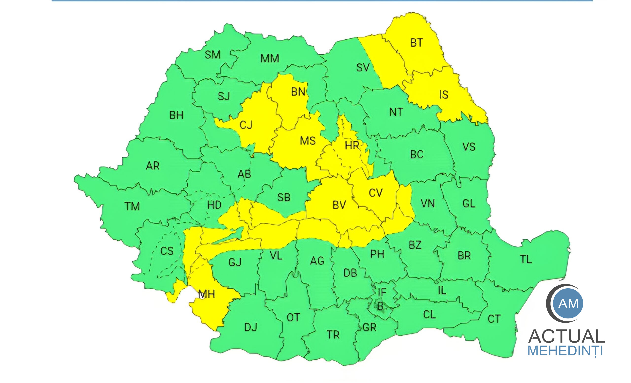 ANM a emis cod galben de vreme rea, valabil astăzi, 24 aprilie, ora 10:00 – ora 21:00. Pe parcursul zilei, în nordul, estul și sud-estul Transilvaniei, nord-estul Moldovei și vestul Olteniei, vor fi intensificări ale vântului cu viteze de 50…65 km/h. În Carpații Meridionali și de Curbură, rafalele vor atinge 70…90 km/h.