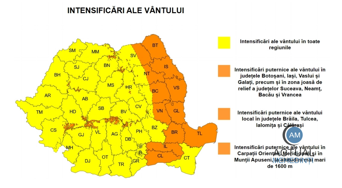ANM a emis cod galben de vreme rea, valabil în 26 aprilie, ora 09:00 – ora 21:00. Pe parcursul zilei de duminică (26 aprilie), vântul se va intensifica la început în nordul, nord-estul și centrul țării, iar după orele amiezii și în restul zonelor. În zonele joase de relief vor fi rafale de 50…70 km/h, iar la munte de 70…90 km/h.
