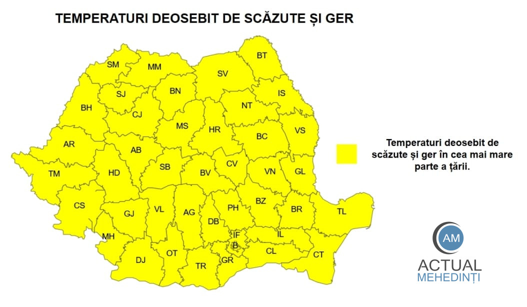 ANM a emis codul galben de ger. Noua avertizare este valabilă în intervalul 19 ianuarie, ora 20:00 – 20 ianuarie, ora 10:00. Temperaturile se vor menține deosebit de scăzute și va fi ger în cea mai mare parte a țării. Temperaturile minime se vor încadra în general între -20 și -8 grade.