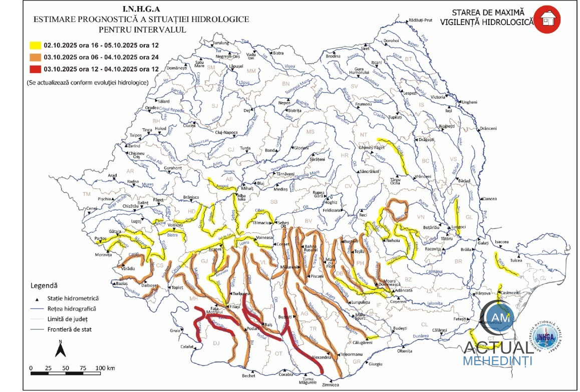 Hidrologii au emis cod portocaliu de inundeții pentru opt județe din țară. Avertizarea vizează râurile din bazinele hidrografice: Dunăre (judeţele: Caraş Severin, Mehedinţi şi Dolj), Desnăţui (judeţele: Mehedinţi şi Dolj), Jiu (judeţele: Gorj, Mehedinţi şi Dolj), râul Jiu (judeţul Dolj), Olt (judeţele: Vâlcea, Argeş, Olt, Gorj şi Dolj), Călmăţui (judeţele: Olt şi Teleorman), Vedea (judeţele: Argeş, Olt şi Teleorman), unde cotele ar putea depăși limitele normale. Avertizarea este în vigoare de vineri de la ora 6.00 până sâmbătă la ora 12.00.