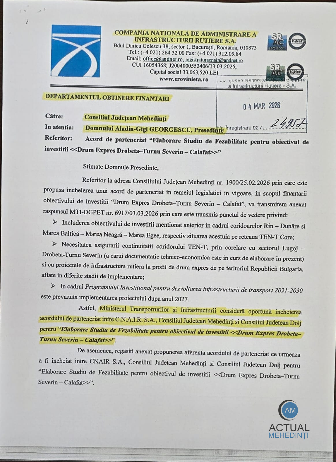 „Mâine, în ședință extraordinară, Consiliul Județean Mehedinți va aproba acordul de parteneriat necesar pentru demararea procedurii de licitație în vederea realizării studiului de fezabilitate pentru acest proiect. Drumul Expres va avea o lungime de aproximativ 70 km, dintre care aproximativ 53 km pe teritoriul județului Mehedinți, pe tronsonul cuprins între limita localităților Șimian și Hinova și până la ieșirea din județul Mehedinți, către Cetate, în județul Dolj. Proiectul va asigura legătura cu autostrada ce se va realiza dinspre Lugoj către Craiova și va direcționa traficul greu către Podul Calafat – Vidin, facilitând conexiunea cu Bulgaria, Grecia și Turcia.”, transmite președintele Consiliului Județean Mehedinți, Aladin Georgescu.